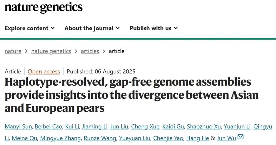 2025年8月6日,吴俊教授团队领衔在《自然·遗传学(Nature Genetics)》上在线发表了题为“Haplotype-resolved, gap-free genome assemblies provide insights into the divergence between Asian and European pears” 的研究论文。该研究以亚洲梨和西洋梨的代表性品种‘砀山酥梨’和‘红巴梨’为试材,构建了高质量无缺口单倍型分型基因组。通过系统整合高质量基因组、多组学数据及群体与数量遗传学分析,率先从单倍型层面系统发掘了亚洲梨和西洋梨遗传差异基础,揭示了长期分化和独立驯化是导致亚洲和西洋梨在品质和适应性上存在显著差异的重要原因,并利用SV-GWAS和SV-基因表达关联等方法精确定位了梨自交不亲和、果实品质和产量等重要农艺性状密切相关的结构变异与关键功能基因,为梨优异性状关键基因挖掘和分子标记开发提供了丰富的遗传信息资源,也为加速梨的分子设计育种和优良性状聚合奠定了理论基础与技术支撑。
