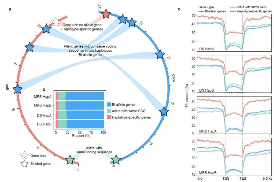 研究以‘砀山酥梨’和‘红巴梨’为研究对象,采用高深度的HiFi、ONT超长测序和Hi-C技术,成功构建了‘砀山酥梨’与‘红巴梨’两个染色体级、无缺口的二倍体分型基因组。与先前研究相比,新组装保留了完整的双单倍型信息,实现了组装质量的显著提升,单倍体基因组大小497.50 Mb-505.55 Mb,contig N50大于28.96 Mb,基因组覆盖度99.99%,锚定到染色体水平100%,达到参考基因组的金标准(基因组数据链接:http://pyrusgdb.sdau.edu.cn/)。对基因组的两套单倍型进行序列比较分析发现,‘砀山酥梨’与‘红巴梨’的单倍型间存在大量遗传变异,且在每个单倍型基因组中存在1,703 – 1,994个单倍型特异基因,这些特异基因与非单倍型特异基因在表达量和甲基化水平上存在显著差异,基因注释表明特异基因与植物病原相互作用及环境适应性相关。此外,还发现‘砀山酥梨’中19.64%,‘红巴梨’中26.21%的等位基因,在单倍型间表达差异显著,涵盖调控果实糖分和石细胞发育的关键基因。这些遗传和表达差异为解析亚洲和西洋梨果实性状遗传基础、发掘优异等位基因资源以及阐明杂种优势形成机制提供了重要依据。