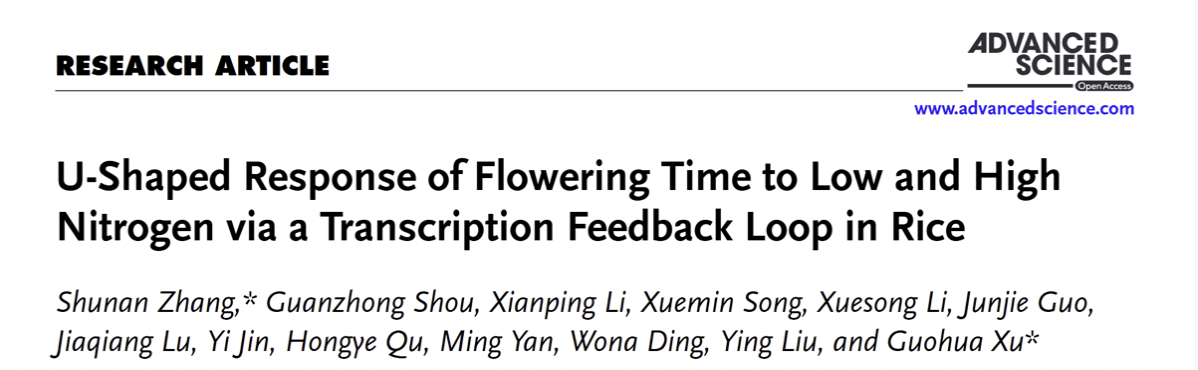 近日,实验室徐国华教授团队在国际权威期刊Advanced Science发表了题为U-Shaped Response of Flowering Time to Low and High Nitrogen via a Transcription Feedback Loop in Rice的研究论文,揭示了一个由氮调控开花促进因子Nhd1与开花抑制因子Ghd7构成的转录负反馈调控环,作为精密的分子开关适应不同供氮状况,调控水稻抽穗期对氮肥响应的U-型模式。